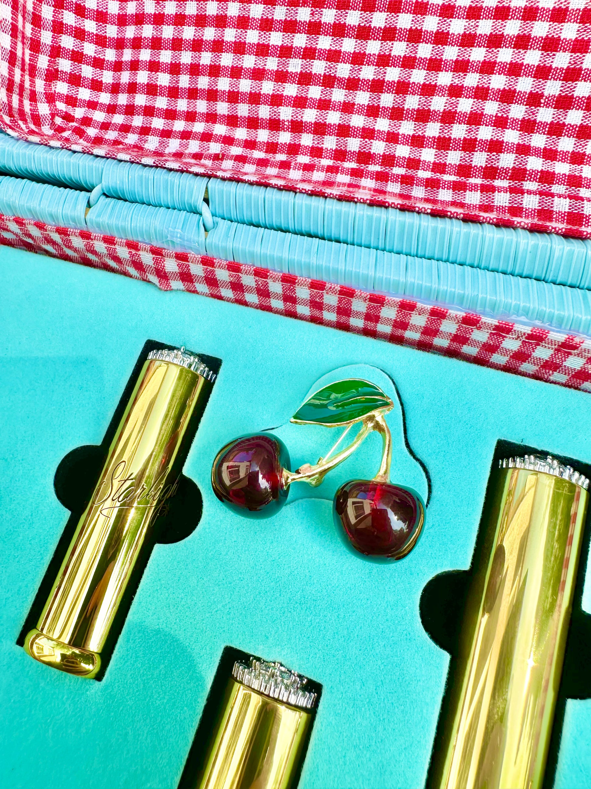 This review is for the beautiful Cherry Jubilee set.🍒 I absolutely love everything about this set! I received so many compliments on the adorable handbag and beautiful cherry brooch. I collect brooches, so I really loved this addition to the set. The formula of the lipsticks themselves are of high quality. The finish, colors, and feel of them are perfection. They are shaped like a true vintage lipstick. The cases are also gorgeous! They are a nice weight, with beautiful crystals and are of a high quality. I love that these lipsticks are refillable and that I can treasure the cases that they came in. I discovered Starlight Vintage Cosmetics online by accident, and I am so glad that I did! Thank you for such wonderful and beautiful products that help to make everyday more special and glamorous!